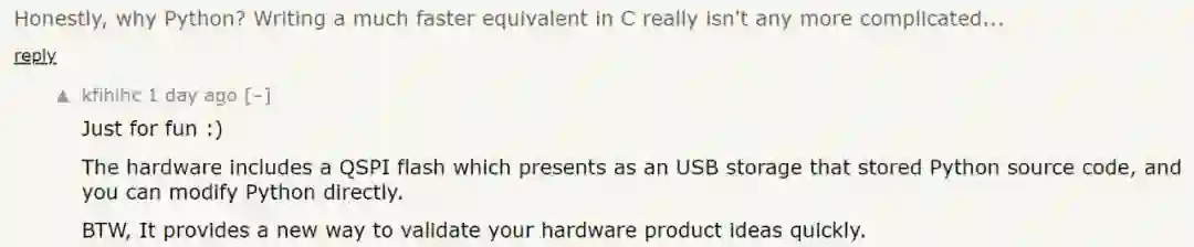 既然用 Python 速度慢,那为什么不用 C 语言写呢?也没有多复杂啊。作者表示,「项目中的硬件包含一个 QSPI 闪存,它是一个 USB 存储,用来保存 Python 源代码,你可以直接改 Python 代码。而且,使用 Python 为快速验证硬件产品的创意提供了一个新的方式。」