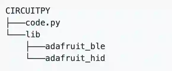 接下来,下载两个 CircuitPython 库:adafruit-ble 和 adafruit-hid,并将它们放入名为 CIRCUITPY 的 USB 驱动器里的 lib 目录中,如下图所示。