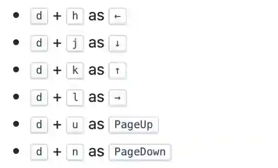 此时 H、J、K、L 键分别被映射为上下左右方向键,而 U 与 N 则被映射为 PgUp 和 PgDn。