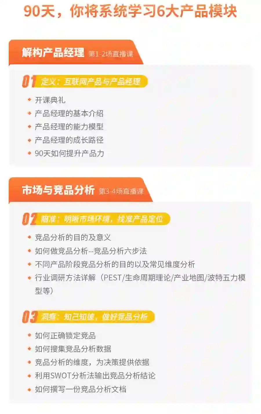 除了能帮你快速了解产品经理的工作流程及所需技能,学完就能用之外;90天产品课程,更加注重高阶思维的培养,如行业分析、产品规划等相关知识内容,能帮你带着上层视角做产品,为未来2-3年的持续成长做好铺垫。
