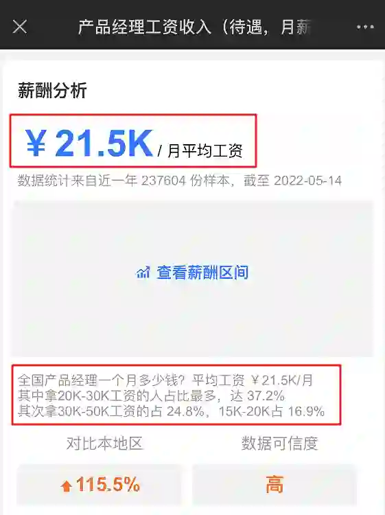 截止2022年-05-14,产品经理平均月工资 21.5K,其中15-20K占16.9%,20K-30K的占37.2%,30K-50K占24.8%。