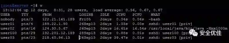 通过这个输出可以检查是否有可疑或者不熟悉的用户登录,同时还可以根据用户名以及用户登录的源地址和它们正在运行的进程来判断他们是否为非法用户。