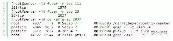通过这种方式基本可以找到任何进程的完整执行信息,此外还有很多类似的命令可以帮助系统运维人员查找可疑进程。例如,可以通过指定端口或者tcp、udp协议找到进程PID,进而找到相关进程: