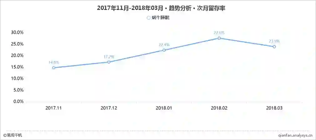 2017年11月-2018年3月蜗牛睡眠APP次月留存率趋势
