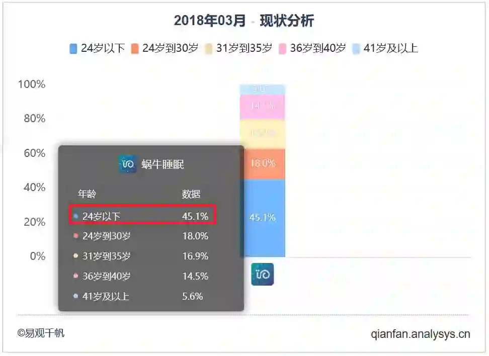 蜗牛睡眠APP从2011年上线起就直击现代社会年轻人无处安眠的痛点,在“催眠”这一核心功能基础上,以颇有趣味的梦话记录分享等功能挑逗起年轻人的好奇心。易观千帆最新数据显示,蜗牛睡眠APP用户中24岁以下占比高达45.1%,用户活跃时段集中在23:00到凌晨1:00和早上6:00到8:00,睡前用APP听催眠曲,被智能闹钟叫醒后立即查看自己有没有说梦话、打呼噜,90后当之无愧成为蜗牛睡眠的忠实粉丝。