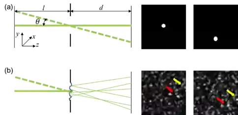 如果圆孔内有大量随机分布的散射颗粒,由于折射率的随机涨落,这时我们在屏上看到的是一幅散斑图。入射激光偏转时,散斑图案相对不变,只是整体位置发生了平移,这种现象就是光学记忆效应。即经过散射后,光子仍然保留对初始入射方向的记忆。