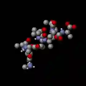 一个 α 螺旋肽分子的热运动。这种不停的运动是既随机又复杂的,而且任一原子的能量起伏都可以很大。然而,使用能量均分定理可以计算出每个原子的平均动能,以及许多振动态的平均势能。灰色、红色及蓝色的球分别代表碳、氧及氮原子,而小白球则代表氢原子。图片来自 wikipedia
