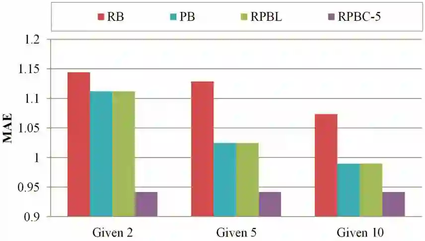 此类算法常常分为两步,首先使用心理学中的调查问卷工具来测量用户的性格特征,然后把用户的性格特征融合到传统的推荐算法中。代表性的工作来自洛桑联邦理工学院的Rong和Pearl,他们在协同过滤的框架中引入了性格特征。如图1所示,根据用户的评分数据以及心理学中的TIPI量表测量得到的大五人格数据,他们使用皮尔逊系数来分别计算两个用户的评分相似性和性格相似性。图2展示了他们的实验结果,可以发现融入性格特征的协同过滤算法能够更好地解决推荐里面常常遇到的冷启动问题。