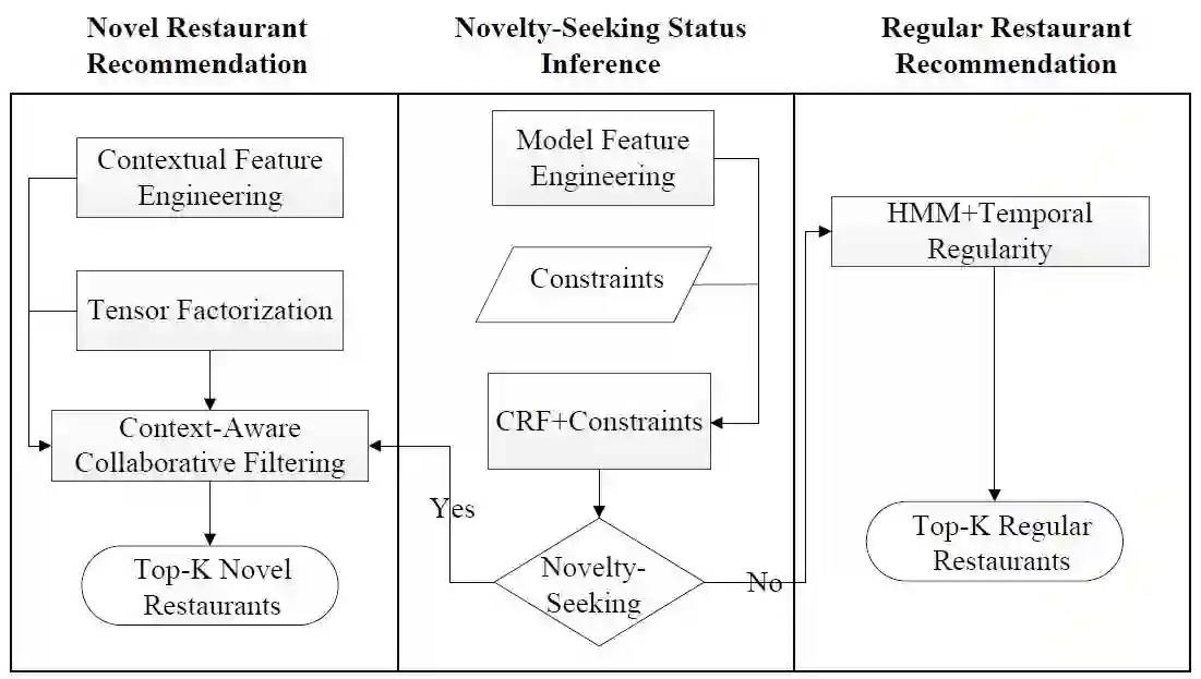 因此,为了区分是推荐去过的餐馆还是推荐新餐馆,我们从用户的历史就餐行为中学习用户对新餐馆的偏好,而这正是用户性格中的猎奇特性。在下一次餐馆推荐时,首先预测用户是否会选择新餐馆,针对新餐馆和去过的餐馆分别设计不同的推荐算法。如下图所示,若预测用户会去新餐馆时,使用基于环境信息的张量分解算法进行推荐;若预测用户可能会去之前去过的餐馆,则使用隐马尔科夫模型进行推荐。我们使用大众点评中的餐馆签到数据进行了实验,发现猎奇推荐算法明显好于协同过滤等基准算法。