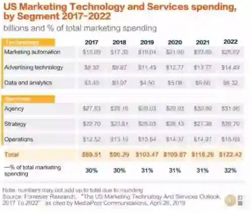 时趣互动创始人张锐指出,2017年,美国企业营销市场是2984亿美金。其70%/2088亿美金用于采购各种媒体广告;30%/895亿美金用于营销技术和服务采购;9.2%/275亿美金是媒介代理服务费用;策略服务中,创意(Strategy)和运营服务(Operations)的钱分别是7.6%/227亿和4.2%/125亿, 两者加在一起占总体的11.8%;然后MarTech的市场为5%/150亿美元, AdTech的市场为3.2%/83.2亿美金,数据分析和服务市场为1.1%/34亿美金。
