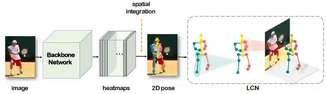 ,提出局部连接网络(Local Connected Network,LCN),以为不同的关节分配专用而非共享的过滤器。利用空间积分的常用可微手段(spatial integral)(参考文献3),我们联合已有的 2D 姿态估计器和 LCN 网络进行端到端训练,使其可以处理不断迭代变化的 2D 姿态。
