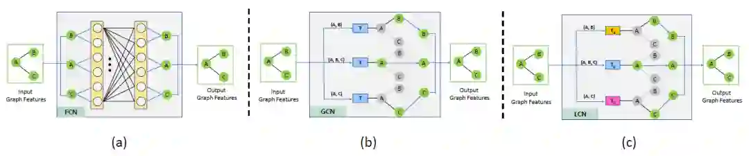 图1. FCN,GCN 与本文所提出的 LCN 模型中某一层网络的概念性差异示意图