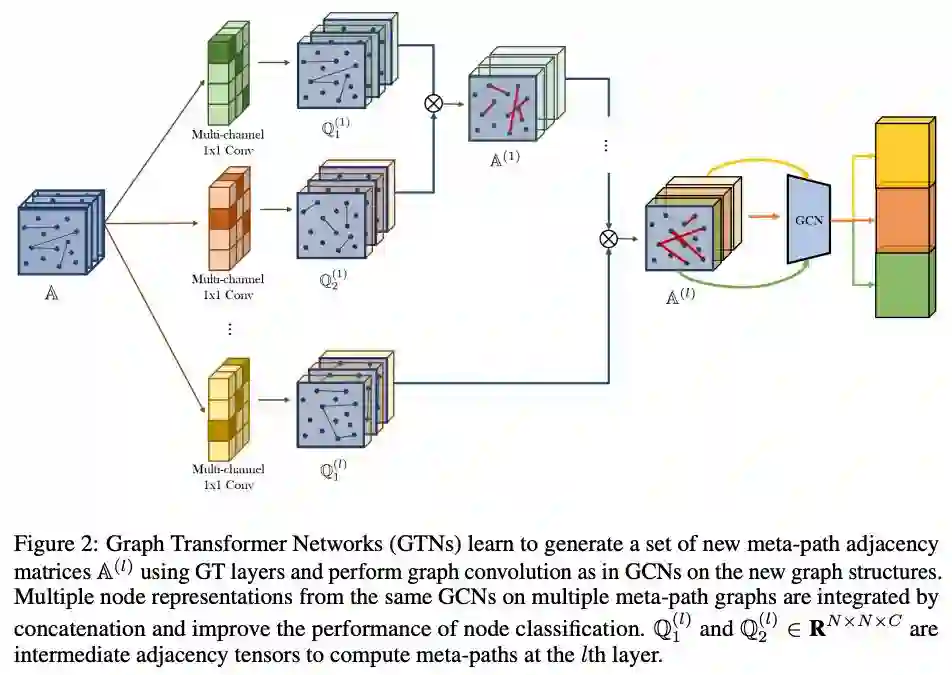 图Transformer网络(GTN)中通过1x1卷积来获取元路径(边组成的链)的表征。