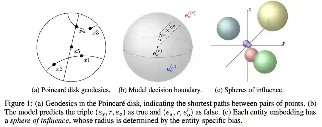 直觉上,正确的三元组客体应该落在主体附近的某个超球面中,相关的这些决策边界是由学习到的参数描绘的。