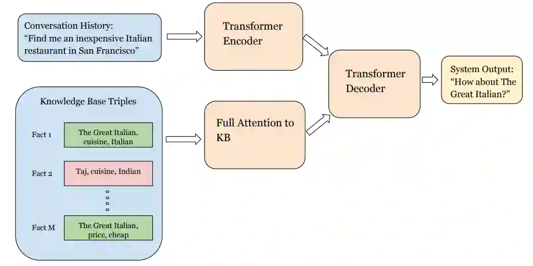 知识库中的内容是简单的单词三元组比如(餐馆A,价格,便宜)(没有 Wikidata 那种花哨的知识图模式),这些三元组也会被Transformer编码。