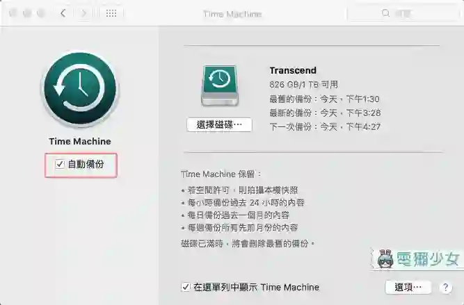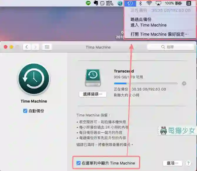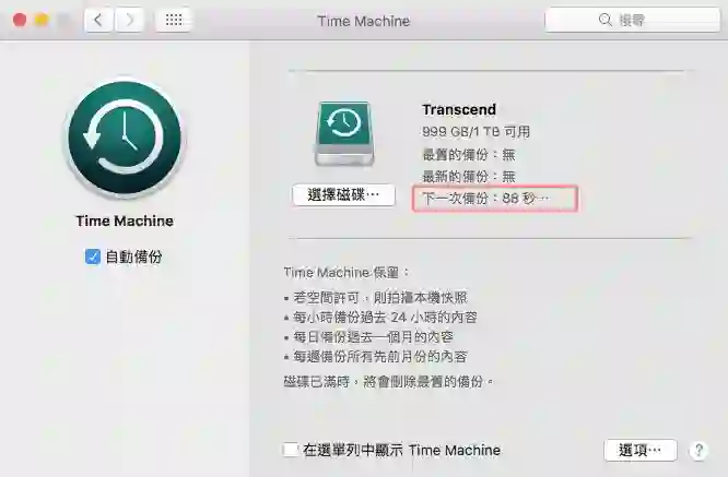 通常第一次备份应该会比较久,大概要几个小时,不过可以边备份边使用电脑(就像我现在边备份边写稿),这点倒是蛮方便的~之后第二次、第三次的备份就都会很快速了,那你如果不喜欢开很多个视窗,你可以选「在选项列中显示Time Machine」,就可以把窗口关掉了,你可以在上方的选项列中看到现在备份的进度。