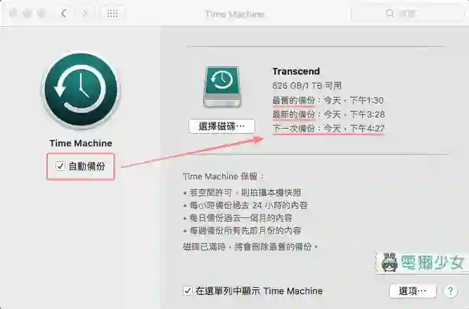 ▼备份完就会显示最新的备份时间是什么时候,如果你有选择「自动备份」,他就会显示出下次电脑主动备份的时间