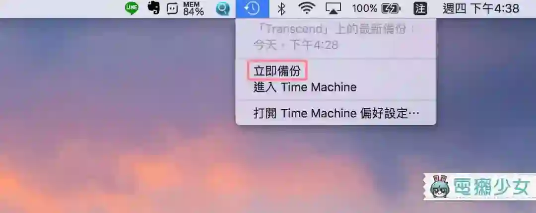 那如果你像贝尔一样不会一直插着硬盘,当你想备份的时候插上硬盘,可以点选『选项列的 Time Machine 选项 中「立即备份」』,就可以再帮电脑进行备份啰