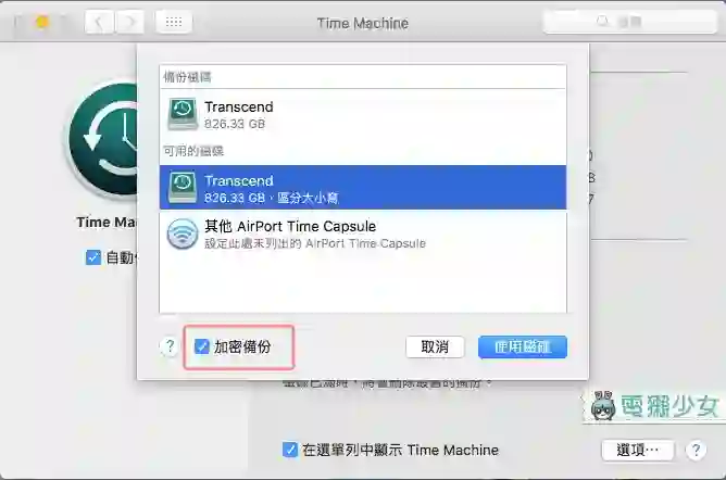 选完要使用的磁盘(及勾选加密备份),系统会要求你清除硬盘裡面的资料才能用Time Machine备份,所以刚刚贝尔就说要准备一个乾淨无资料的硬盘齁~如果跟贝尔一样是拿一块全新的硬盘,清除资料的速度非常快几乎不用等几分钟(因为是空的嘛)。