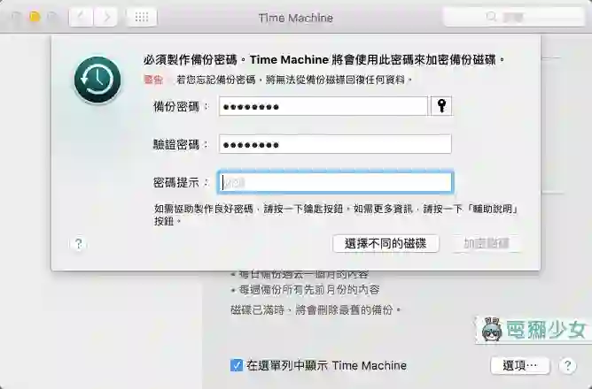 这边帮大家插播一个动作!如果你把档案存在硬盘裡面,有一天硬盘不见了,偷走的人接上电脑就可以轻易回复你的备份,所以大家可以看自己的需求,选择要不要把自己的备份资料加上密码,就算硬盘不见也不怕被人窃取资料啦(嗯?),如果不需要可以直接跳过这步骤了~后续你再次接上硬盘时就会要求你要输入密码,才能看到你备份的资料,贝尔建议要初次备份前就先设定好加密备份,不要像我一样备份完才做加密备份的动作...花了久到我无法理解的时间...(就是我整篇文章已经写完了还没加密好...)。