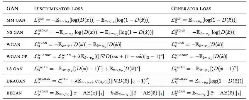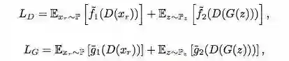 虽然近几年许多研究人员提出了很多新的损失函数,但它们相比SGAN没有太多根本上的进展,因此大多数GAN可以用non-saturating和saturating函数简单地分成两类:g1=− f1 and g2=− f2,saturating;g1=f1 and g2=f2,non-saturating。从本质上来说,它们有一定的相通之处,为了后面方便对比,本文假设所有GAN都用non-saturating损失函数。