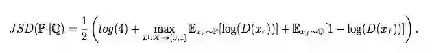 在SGAN中,我们认为判别器损失函数等于Jensen-Shannon散度(JSD)。因此,计算JSD可以等同为计算这个式子的最大值: