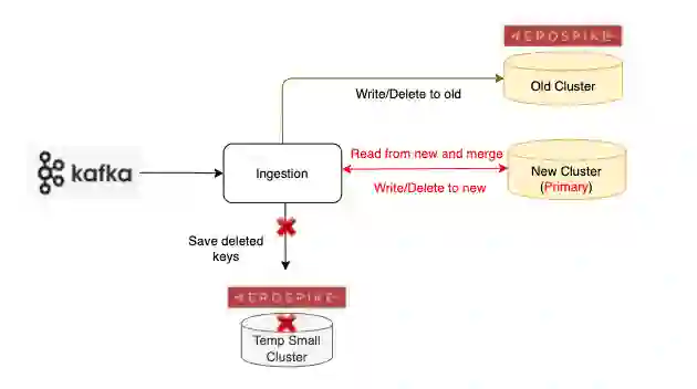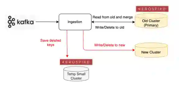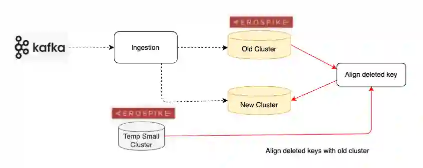 通过记录 delete 的 keys 来进行 replay 对齐新旧集群的数据。在进行 replay 的阶段,会暂停 Ingestion 端的数据写入,防止误删后续新加入进来的数据。基于临时 Aersospike 集群的高性能,几个 region 分别根据 delete keys 重放两次的情况下(第二次重放是为了进一步保证数据都彻底删干净),存储的约五亿个 keys 的处理时间总共大约只需一个小时左右。其中由于并不是所有记录下的 delete keys 都真的需要对集群里数据进行实际操作(可回顾“加速新旧集群的数据对齐 ”里对于 delete keys 的情况分析,有一些记录的 delete keys 已经并不存在新集群里了)。实践中实际处理的数据约五千万,命中率约 9%。所以对于 Ingestion 暂停的影响非常小,后续可以通过加大 Ingestion 速率来快速追赶这一个小时的数据。