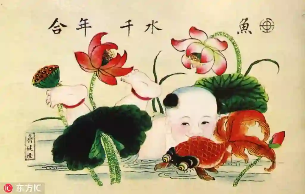 后来,随着我知识水平的不断提高,谜底才逐渐解开——大胖小子抱金鱼的年画寓意“丁财两旺,年年有余”。大胖小子是传统中国父母眼中孩子的圆满形象,而金鱼如果按真实比例来画,未免太过小气,所以得把它画大些。