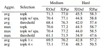 随后,是Pseudo positive mining的过程,对应图中的步骤3,该过程是利用“过滤”后的训练元组从训练元组候选集发掘正样本,它是一个迭代的过程。首先将查询集设置为“过滤”后的训练元组,然后计算查询集与候选集中每一张图像的得分,根据得分从候选集中挑选图像进入查询集。重复这个过程。在表2中(下图),我们比较了不同的得分计算方式和挑选策略,发现avg加topk 4x的效果最好。