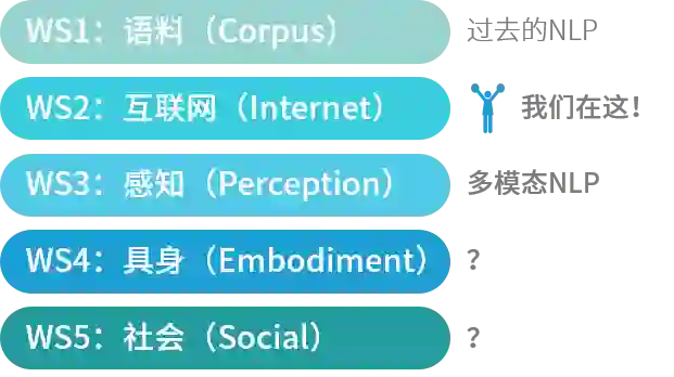 首先,如果单纯利用一个诸如神经网络的通用的函数拟合器来给文本做分类,它可能单纯利用了文本中的语法语义信息,却永远不会认为文本中出现的人、事物和因果关系是真实存在的。这需要我们向模型中引入足够的归纳偏置(Inductive bias)来解决这一问题。其次,基于交叉熵的损失函数使得NLP系统不够关注数据分布的尾端,导致出现较少的事件被忽视了。最后,由于现有的系统依然无法达成像人类一样的归纳能力,NLP系统的零次学习能力依然有待提高。因此,WS1-4的数据无论再大,以目前的系统设计也难以让NLP系统学到足够丰富的知识来降低模型的困惑度。