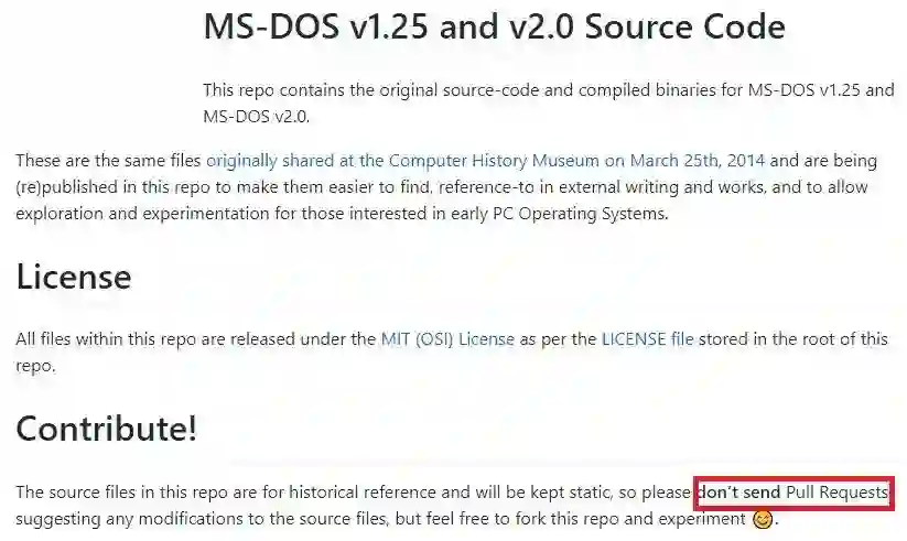 DOS是最早用于个人计算机上的操作系统。从 1981 年到 1995 年的 15 年间,DOS 在 IBM PC 兼容机市场中占有举足轻重的地位。直到现在 DOS 没有完全退出历史舞台,日常在重装电脑时就是在 DOS 下的操作。不过令人唏嘘的是,前不久微软开源MS-DOS操作系统(https://github.com/microsoft/MS-DOS),并在项目首页用粗体特别标注了不要提交PR,一代操作系统界的霸主以这样的方式谢幕,不知道算不算是最好的告别。
