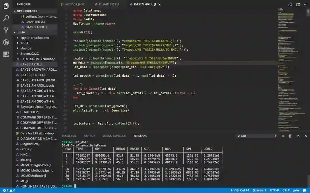 Visual Studio Code的Julia扩展提供了语法高亮、代码片段、LaTex片段、Julia特定命令、集成REPL、代码补全、悬浮提示、代码检查、代码导航等功能,以及用于运行测试、构建、性能评测、构建文档的Visual Studio Code任务。