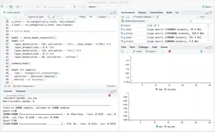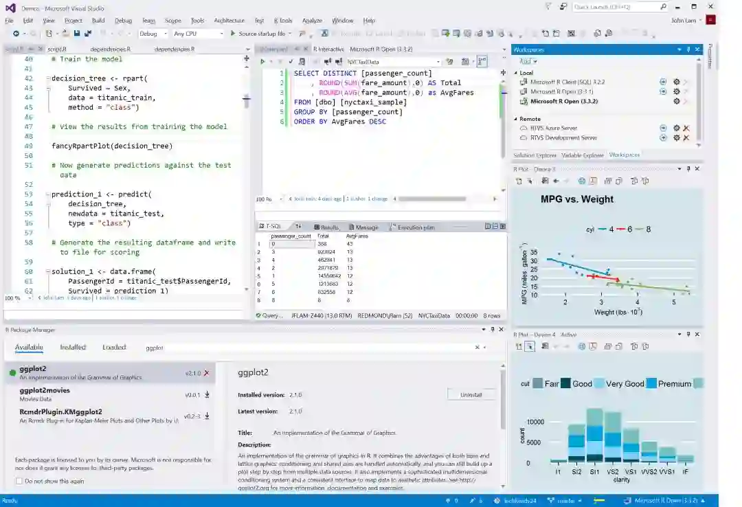 在Visual Studio下,数据科学家能够以便利的结构组织和管理相关文件,并使用R代码、R文档、R Markdown、SQL请求、保存的过程等的模板。同时提供了包管理器和SQL Server集成。