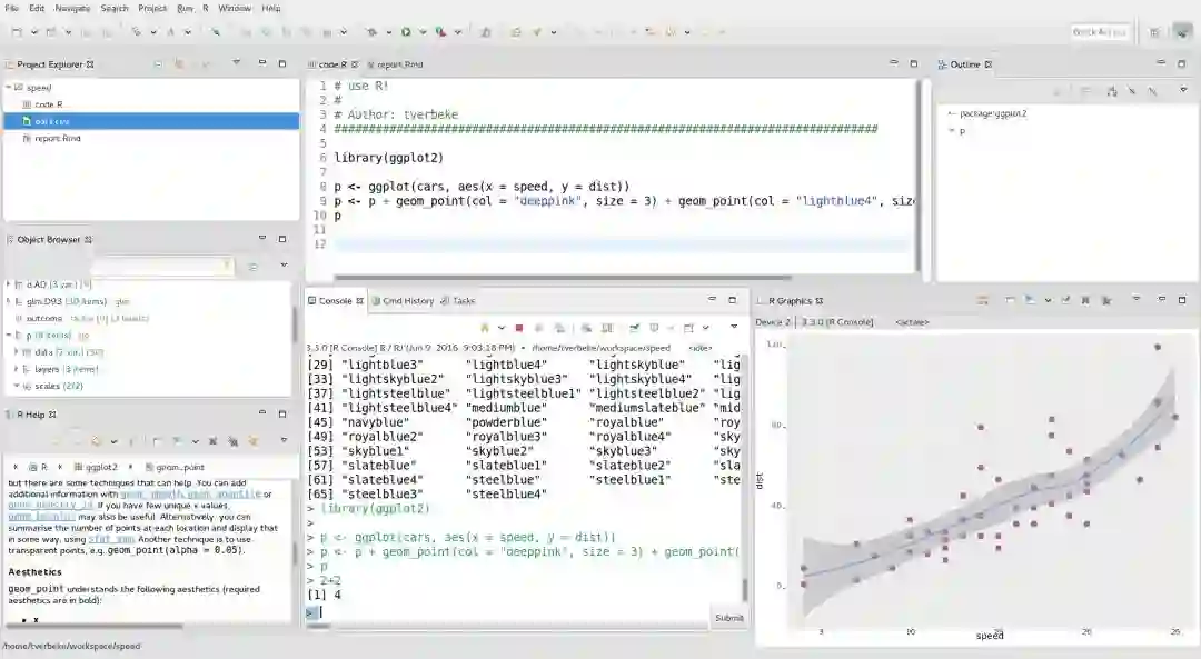 Eclipse是最流行的Java IDE之一。通过安装插件,它可以支持其他编程语言。StatET是一个基于Eclipse的R IDE。它提供了编写R代码和构建R软件包的一组工具,包括集成的R控制台、对象浏览器、包管理起、调试器、数据查看器、R帮助系统,并支持本地和远程安装的多个R版本。可选的Sweave和Wikitext(Markdown和Textile)附加组件提供了带有R代码段的LaTeX/Wikitext文档的源代码编辑器和构建工具。