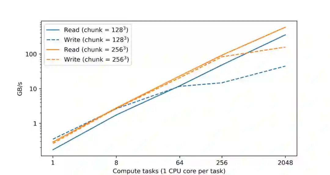 在谷歌云存储 (GCS) 上对 zarr 格式数据集的读写性能,读和写性能与计算任务的数量几乎成线性增长。