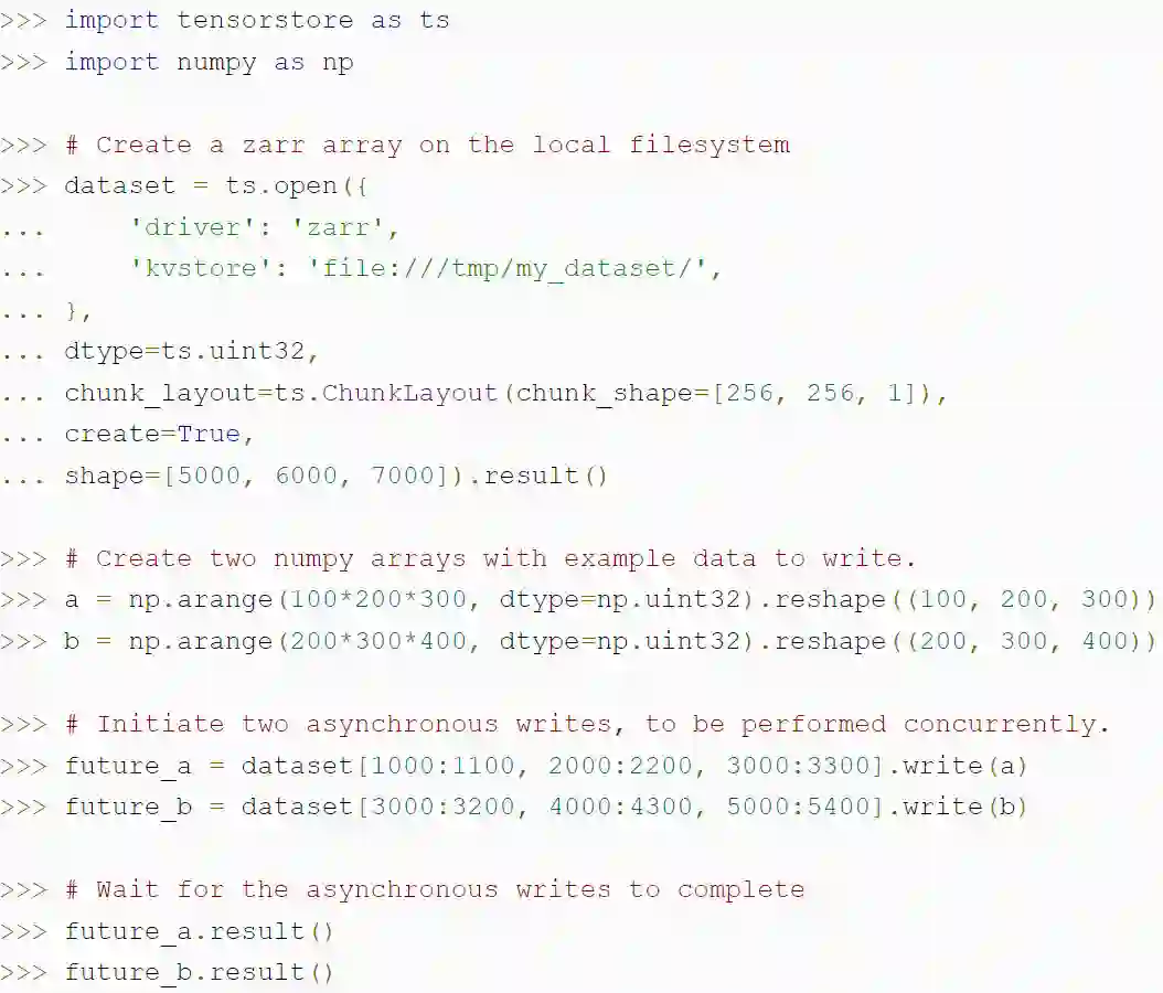 下面的代码演示了如何使用 TensorStore 创建一个 zarr 数组,以及 TensorStore 的异步 API 如何实现更高的吞吐量: