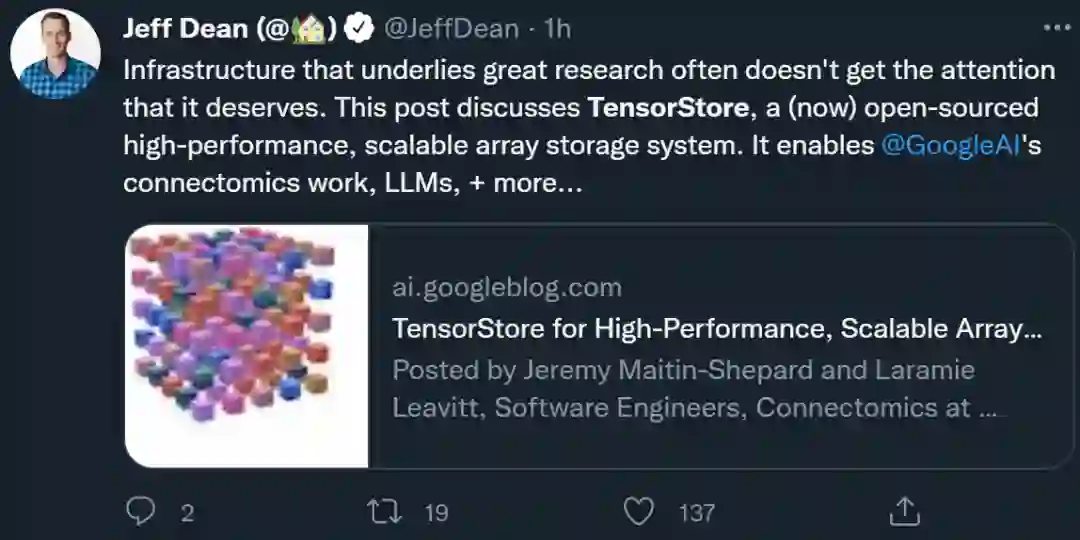 为了解决上述问题,谷歌开发了一个开源的 C++ 和 Python 软件库 TensorStore,专为存储和操作 n 维数据而设计。谷歌 AI 负责人 Jeff Dean 也在推特上发文表示 TensorStore 现已正式开源。