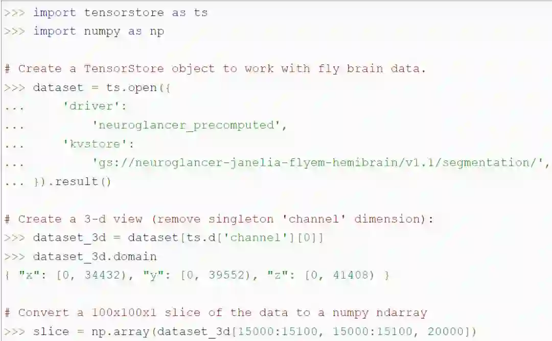 TensorStore 提供了一个简单的 Python API 用于加载和操作大型数组数据。例如,下面的代码创建了一个 TensorStore 对象,该对象代表一个 56 万亿体素的苍蝇大脑 3D 图像,并允许访问 NumPy 数组中 100x100 的图像 patch 数据: