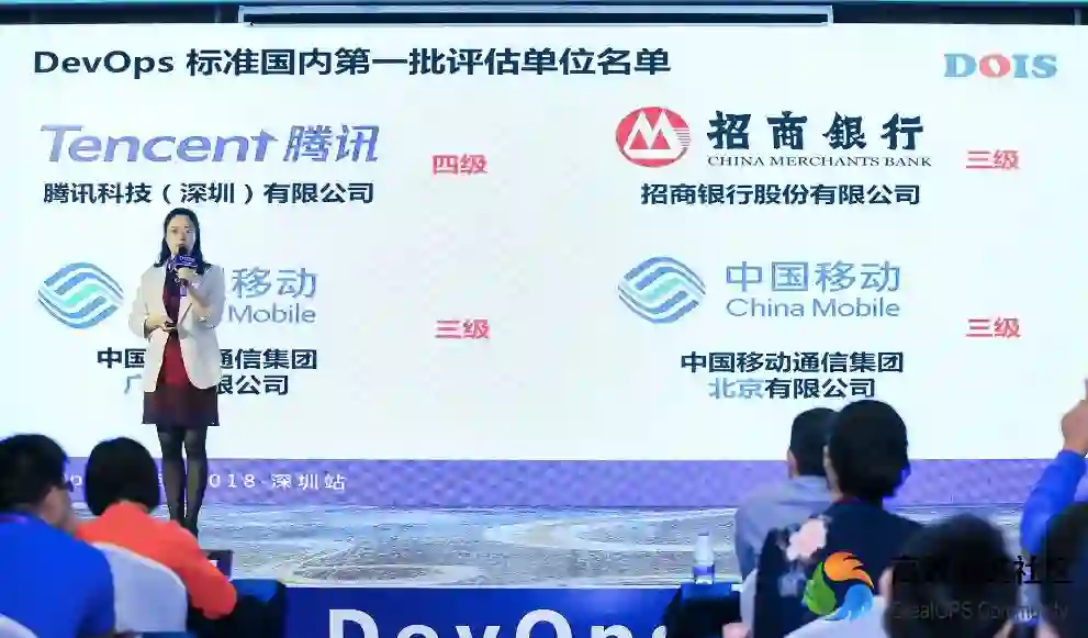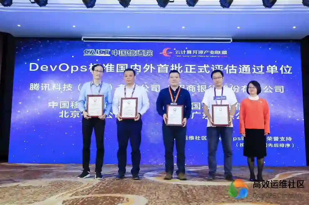 2018年11月2日在深圳召开的 DevOps 国际峰会(DOIS)· 深圳站上,北京移动电子商务系统获得由中国信息通信研究院主持颁发的《研发运营一体化(DevOps 标准)能力成熟度模型》评估证书,证书编号 G01010。