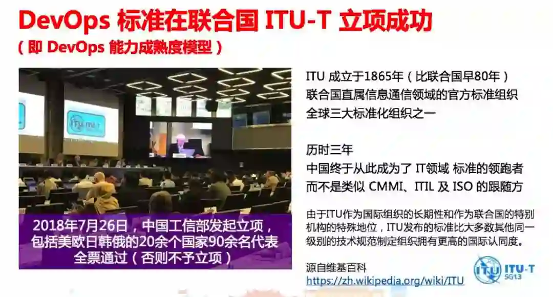 DevOps 标准《研发运营一体化能力成熟度模型》由 OSCAR 联盟、高效运维社区 和 DevOps 时代社区联合发起,汇聚了国内 3BATJ 等一线互联网企业、通信、金融等行业顶级单位及专家共同编制而成,此标准目前已在中国通信标准化协会(CCSA)立项,并在国际电信联盟(联合国ITU-T)立项成功,成为国际标准。