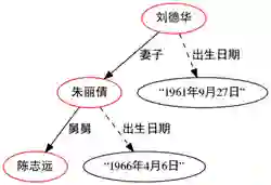 知识图谱是一种典型的图结构数据集合,实体是图中的节点,关系(属性)是带有标签的边。因此,基于图结构的存储方式能够直接正确地反映知识图谱的内部结构,有利于知识的查询。如下图所示,红色圈代表实体,实线是边(妻子),表示实体间的关系,如“刘德华的妻子是朱丽倩”,虚线是属性(出生日期),表示实体具有的属性,如“刘德华的出生日期是 1961 年 9 月 27 日”。