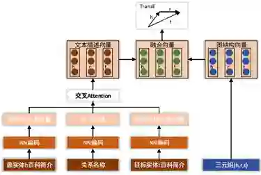 当前采用的嵌入模型是 TextEnhanced+TransE,模型结构如图 25 所示。TransE 是将实体与关系映射到同一向量空间下,它是依据已有的边关系结构对实体之间的边关系进行预测,对孤立实体或链接边较少的实体预测效果较差。为了引入文本信息,解决模型对孤立实体预测的难题,模型使用 TextEnhanced 对文本信息进行嵌入。TextEnhanced 通过 NN 模型对文本信息嵌入后,利用 Attention 机制将文本信息嵌入到 Trans 系列的实体向量中,进而对尾实体进行预测。
