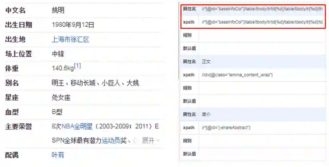 许多网站提供了大量的结构化数据,如(图 4 左)所示的百科 Infobox 信息。这种结构化知识很容易转化为三元组,如:“<姚明,妻子,叶莉>”。针对结构化数据的抽取,我们设计了基于 Xpath 解析的抽取平台,如(图 4 右)所示,我们只需要定义好抽取网页的种子页面如:baike.com,然后从网页源码中拷贝 Infobox 中属性的 xpath 路径即可实现结构化知识的自动抽取,入库。通过结构化抽取平台生成的数据准确率高,因此无需人工参与审核即可直接入库,它是知识图谱的重要数据来源。