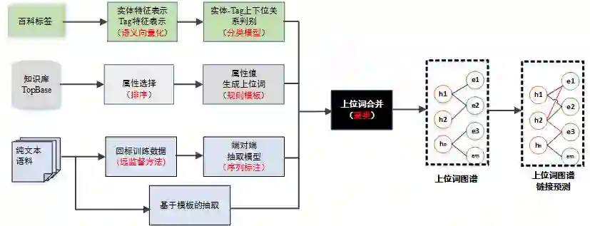 1 ) 上位词抽取: 上位词可以理解为实体细粒度的概念,有助于更好的理解实体含义。图 7 是构建上位词图谱的一个简要流程图,其中主要从三路数据源中抽取上位词数据,主要包括:知识图谱的属性数据,百科人工标注 Tag,纯文本语料。由于抽取得到的上位词表述多样性问题,所以需要在抽取后进行同义上位词合并。此外,抽取生成的上位词图谱也会存在着知识补全的问题,所以需要进一步的进行图谱的连接预测,进行上位词图谱的补全。