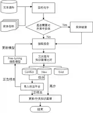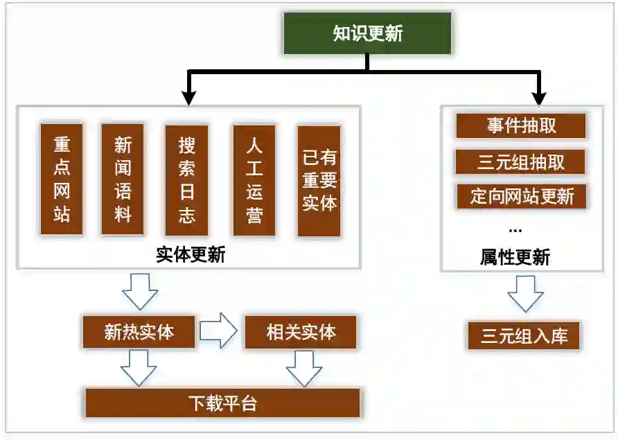 知识更新主要包括两方面内容,一个是新出现的热门实体,需要被及时发现和下载其信息,另一个是关系属性变化的情况需要对其值进行替换或者补充,如明星的婚姻恋爱关系等。知识更新的具体流程如下图所示: