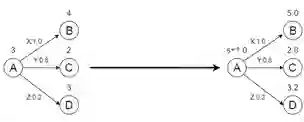 实体 A 指向实体 B、C、D。其与 B 之间的链接类型为 X,与 C 之间的链接类型为 Y,与 D 之间的为 Z。通过先验知识或实验总结,我们认为链接类型 Y 可信性不高,相比于 X,对 rank 值的流转有拟制作用,因此对其赋予一个系数 0.8,Z 的可信度很准确,但其性质与上述的音乐网站的关系类似,因此对于其赋予一个系数 0.2,而 X 类型的完全可行,其系数则为 1.0。在某一迭代阶段,实体 A 的 rank 值为 3,B、C、D 的 rank 值分别为 4、2、3。由于 A 有 3 条出边,因此到 B、C、D 的初始流出值均为 3/ 3 = 1。加上系数的影响,实际到 C、D 的流出值分别为 0.8 和 0.2,未流出的剩余值为(1 -0.8) + (1 - 0.2) = 1.0。
