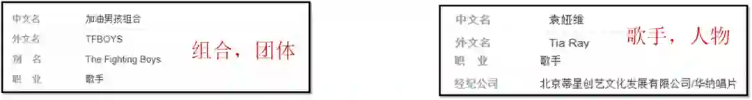 属性名称:除了通用类的属性名称,如:中文名,别名,正文,简介等,其他属性名称都作为特征;