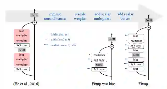 在不使用规范化的情况下进行训练。我们提出了 Fixup 技术——一种通过修改网络的结构,对残差分支的标准初始化进行放缩的方法。Fixup 在不使用规范化对极深的残差网络训练时,可以使用最大的学习率。