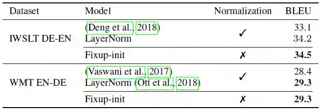机器翻译。 我们使用 Fixup 替代了规范化层,在机器翻译的基准数据库 IWSLT 和 WMT 使用 Transformer(一种发表于 2017 年 NeurIPS 的目前最好的机器翻译算法 )模型进行了训练。发现该方法可以超过基准线并在相同的框架下取得目前最好的结果。
