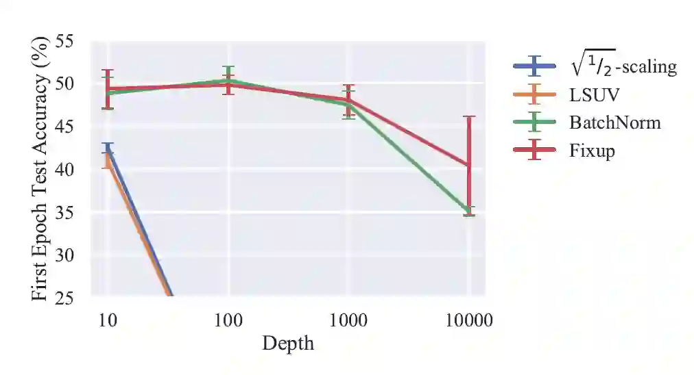 在一个使用了 ReLU 函数的残差网络中,如果我们移除了所有的规范化层,根据这些猜想可得到所有的偏置都被初始化为 0。